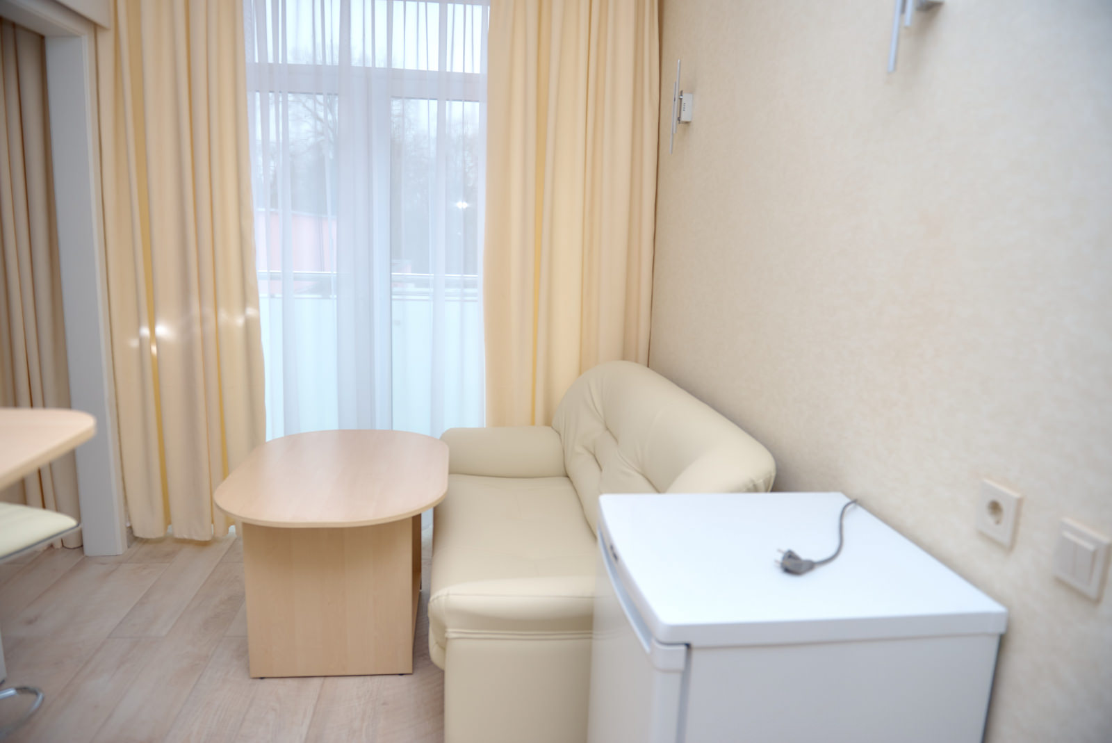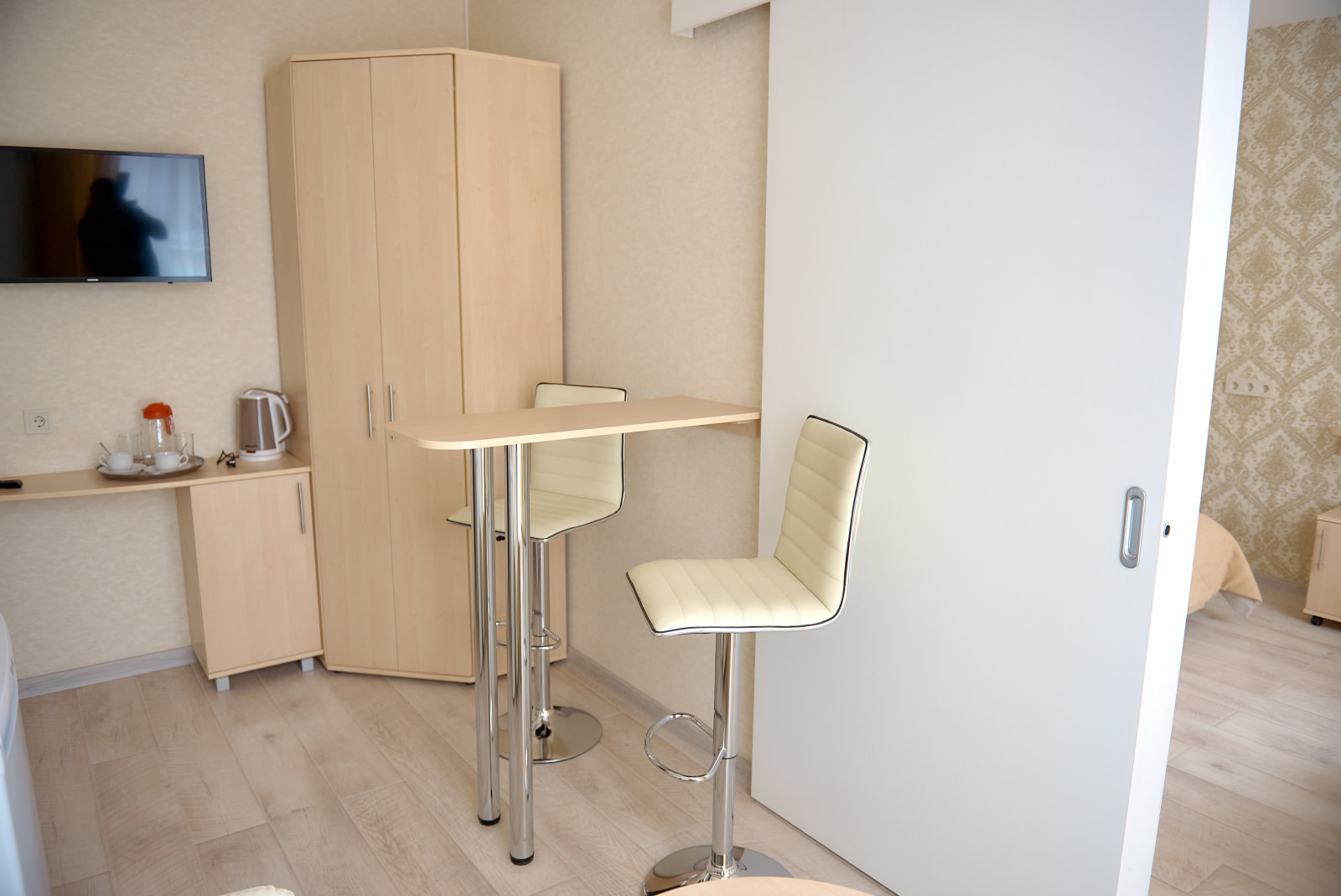 2 осн. места. 1 доп. место. Мебель: вешалка, зеркало, кресло, кровать двуспальная, прикроватные тумбочки, стол, стул, шкаф. Оборудование: мини-холодильник, телевизор, утюг, чайный набор посуды, электрочайник. Санузел: с ванной, туалетные принадлежности, фен. Сервис: смена полотенец, смена постельного белья, уборка номера.