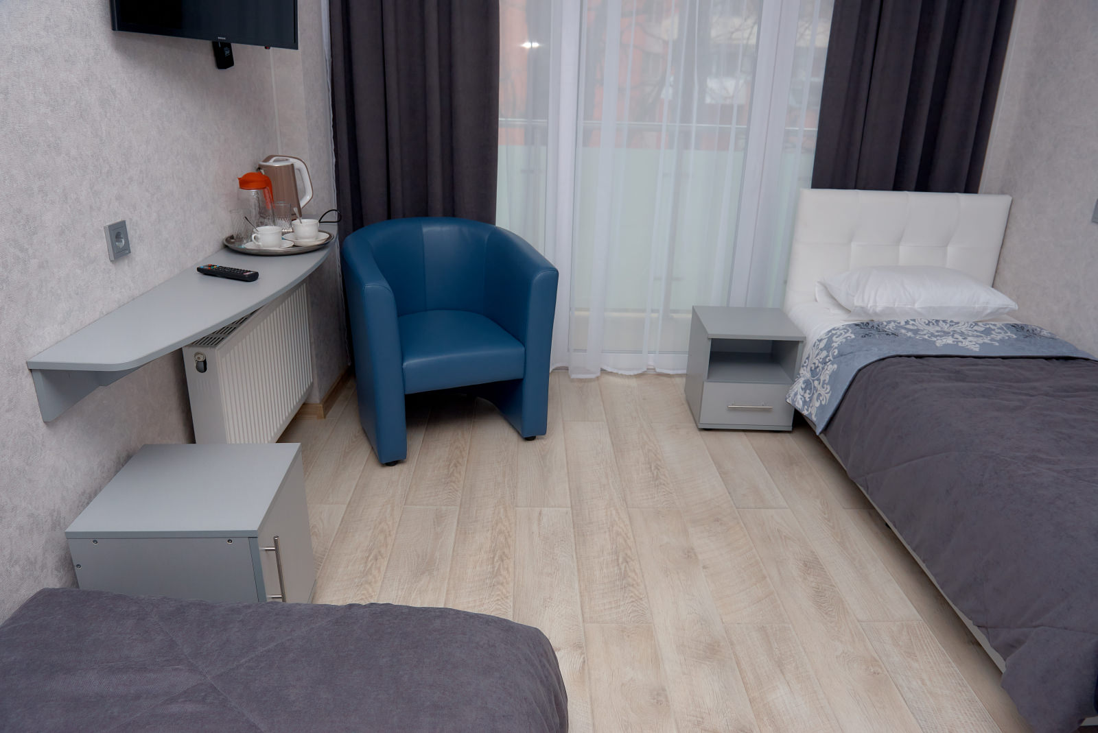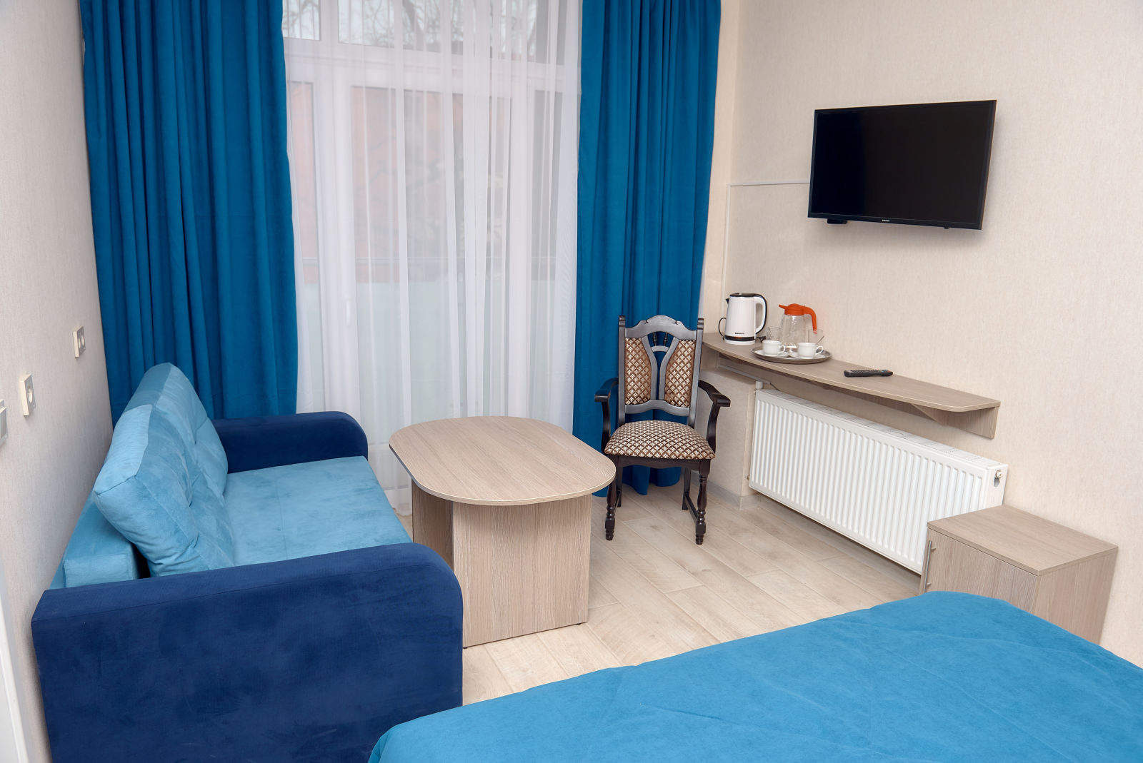 2 осн. места. 1 доп. место. Мебель: вешалка, зеркало, кресло, кровати односпальные /одна двуспальная кровать, прикроватные тумбочки, стол, стул, шкаф. Оборудование: мини-холодильник, телевизор, чайный набор посуды, электрочайник. Санузел: с ванной, туалетные принадлежности, фен. Сервис: смена полотенец, смена постельного белья, уборка номера.